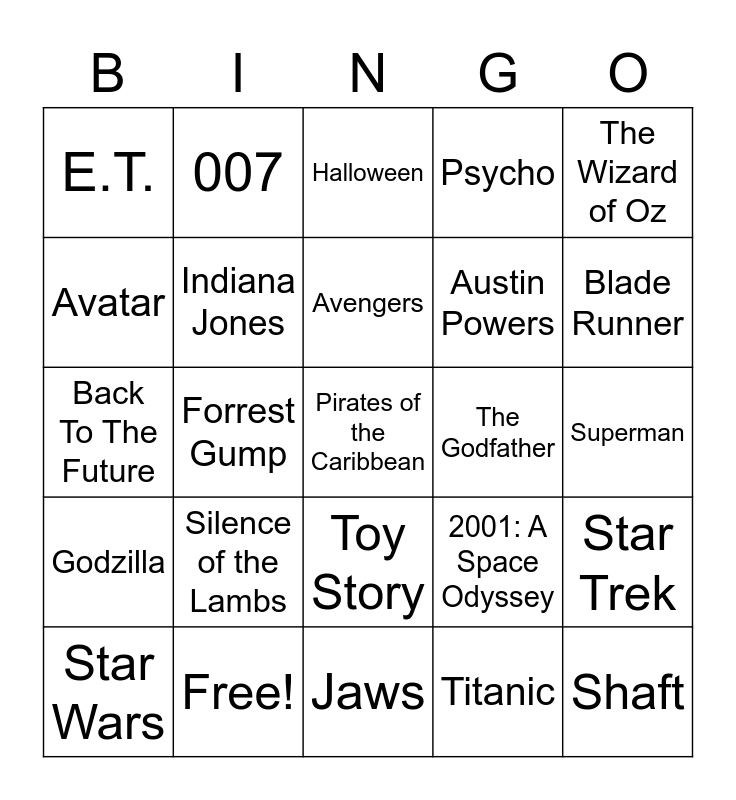 This bingo card has 30 words: Free!, Rocky, Forrest Gump, Ghostbusters, E.T., Halloween, Indiana Jones, Toy Story, The Godfather, Jaws, Superman, Pirates of the Caribbean, Titanic, Shaft, Blade Runner, The Good, The Bad, & The Ugly, 2001: A Space Odyssey, Godzilla, Silence of the Lambs, The Wizard of Oz, Back To The Future, Jurassic Park, 007, Austin Powers, Avatar, Psycho, Star Trek, Star Wars, Avengers and Beauty and the Beast.