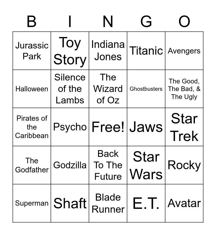 This bingo card has a free space and 28 words: Rocky, Forrest Gump, Ghostbusters, E.T., Halloween, Indiana Jones, Toy Story, The Godfather, Jaws, Superman, Pirates of the Caribbean, Titanic, Shaft, Blade Runner, The Good, The Bad, & The Ugly, 2001: A Space Odyssey, Godzilla, Silence of the Lambs, The Wizard of Oz, Back To The Future, Jurassic Park, Austin Powers, Avatar, Psycho, Star Trek, Star Wars, Avengers and Beauty and the Beast.