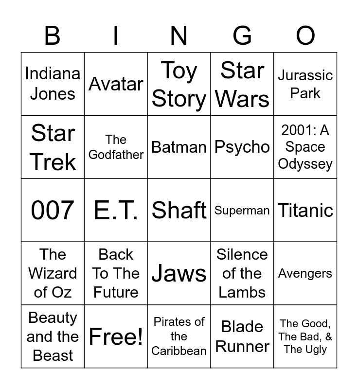 This bingo card has 30 words: Free!, Ghostbusters, E.T., Halloween, Indiana Jones, Toy Story, The Godfather, Jaws, Superman, Pirates of the Caribbean, Titanic, Shaft, Blade Runner, The Good, The Bad, & The Ugly, 2001: A Space Odyssey, Godzilla, Silence of the Lambs, The Wizard of Oz, Back To The Future, Jurassic Park, 007, Austin Powers, Avatar, Psycho, Star Trek, Star Wars, Avengers, Beauty and the Beast, Batman and Blazing Saddles.