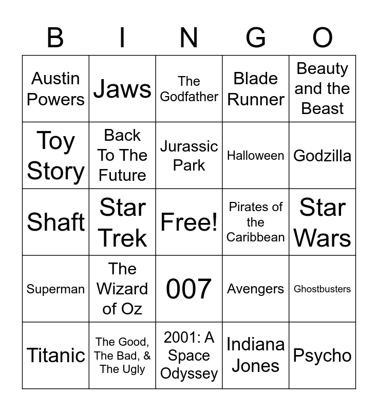 This bingo card has a free space and 28 words: Ghostbusters, E.T., Halloween, Indiana Jones, Toy Story, The Godfather, Jaws, Superman, Pirates of the Caribbean, Titanic, Shaft, Blade Runner, The Good, The Bad, & The Ugly, 2001: A Space Odyssey, Godzilla, Silence of the Lambs, The Wizard of Oz, Back To The Future, Jurassic Park, 007, Austin Powers, Avatar, Psycho, Star Trek, Star Wars, Avengers, Beauty and the Beast and Batman.