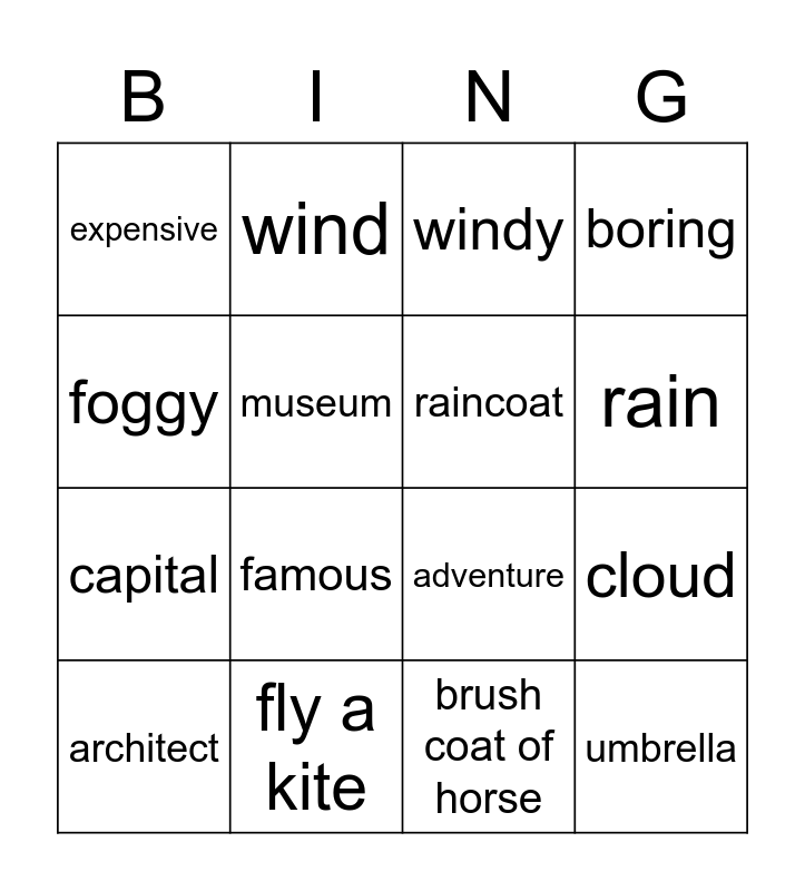 This bingo card has 32 words: thunderstorm, lightning, cloud, rainy, umbrella, raincoat, foggy, boots, wind, cloudy, rain, windy, fog, castle, fly a kite, matter, fool, adventure, horse, pony, feed, ride, brush coat of horse, stable, architect, boring, capital, museum, expensive, fold, built and famous.
