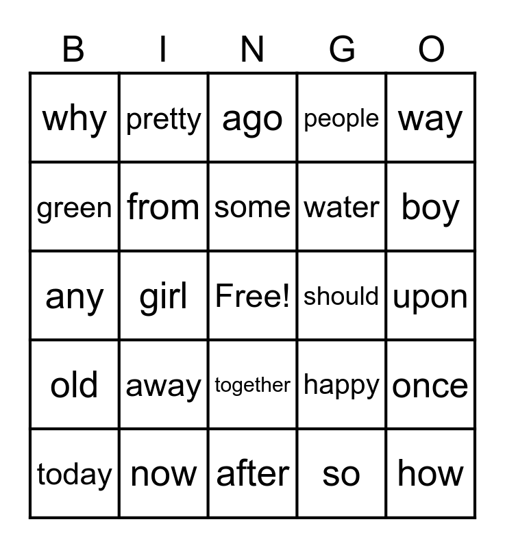 This bingo card has a free space and 24 words: away, now, some, today, way, why, green, pretty, should, together, water, any, happy, once, from, so, upon, ago, boy, girl, how, old, people and after.
