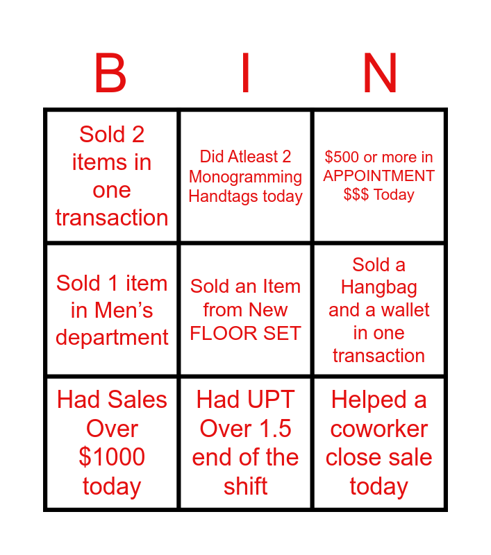 This bingo card has a free space and 8 words: Sold a Hangbag and a wallet in one transaction, $500 or more in APPOINTMENT $$$ Today, Did Atleast 2 Monogramming Handtags today, Had Sales Over $1000 today, Sold 2 items in one transaction, Helped a coworker close sale today, Sold 1 item in Men’s department and Had UPT Over 1.5 end of the shift.