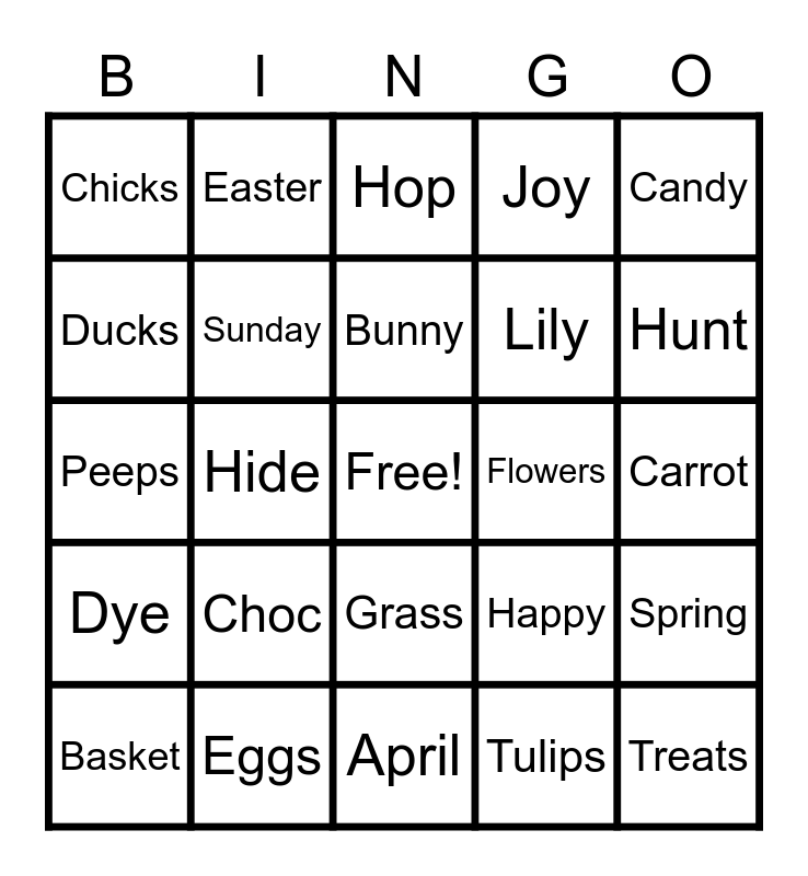 This bingo card has a free space and 24 words: Choc, Eggs, Bunny, Basket, Candy, Chicks, Ducks, Easter, Flowers, Grass, Lily, Peeps, Happy, Spring, Sunday, Tulips, Carrot, Hop, Hunt, Hide, Treats, Dye, Joy and April.