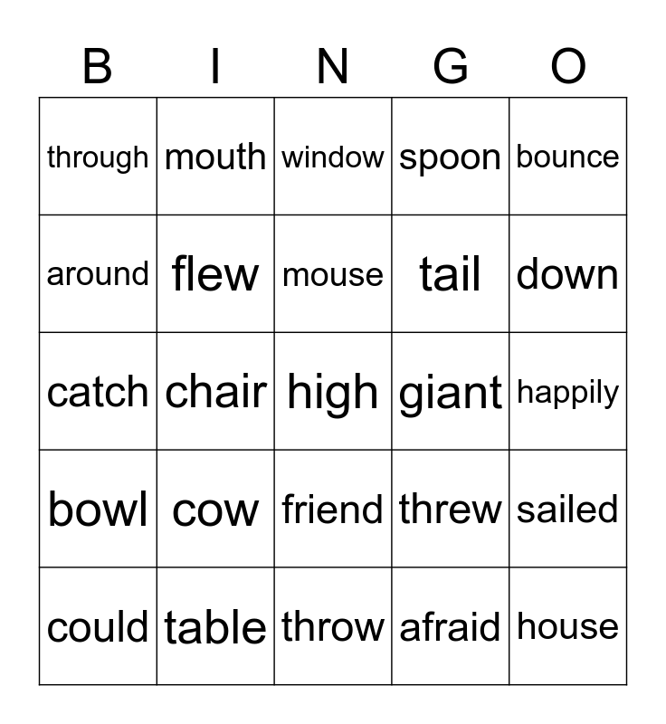 This bingo card has 25 words: cow, throw, mouse, could, bounce, through, around, mouth, giant, friend, tail, catch, threw, sailed, flew, house, happily, window, down, chair, high, table, bowl, spoon and afraid.