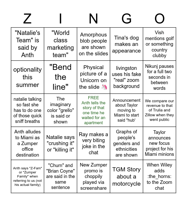 This bingo card has a free space and 29 words: Anth types "BOOM" in the chat, "Churn" and "Brian Coyne" are said in the same sentence, Amorphous blob people are shown on the slides, talent is distributed evenly, but opportunity is not, Vish mentions golf or something country clubby, "Natalie's Team" is said by Anth, "Bend the line", Physical picture of a Unicorn on the slide 🦄, Announcement about Taylor moving to Miami to start said "hub', Taylor announces new focus project for his Miami minions, Anth says "Z-Fam" or "Zumper Family" when referring to us (not his actual family), The imaginary color "grello" is said or shown, TGM Story about a motorcycle, When Wiley adds :the_horns: to the Zoom chat, natalie talking so fast she has to do one of those quick sniff breaths, PowerLeadsAI 🤖, New Zumper promo is choppily played via screenshare, Graphs of people's genders and ethnicities are shown, Nikunj pauses for a full two seconds in between words, Anth alludes to Miami as a Zumper office destination, Natalie says "crushing it" or "killing it", marketing repositioning zumper as woke, livingston uses his fake "real" zoom background, We compare our revenue to that of Trulia and Zillow when they went public, optionality this summer, "World class marketing team", Ray makes a very biting joke in the chat, Tina's dog makes an appearance and Anth puts his hood up.