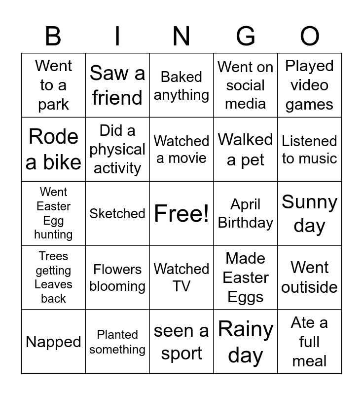 This bingo card has a free space and 24 words: Flowers blooming, Planted something, Watched a movie, Napped, Played video games, Went to a park, Rode a bike, Saw a friend, April Birthday, Watched TV, Walked a pet, Went Easter Egg hunting, Made Easter Eggs, Went outiside, Did a physical activity, Rainy day, Sunny day, Baked anything, Listened to music, Sketched, Ate a full meal, Trees getting Leaves back, Went on social media and seen a sport.