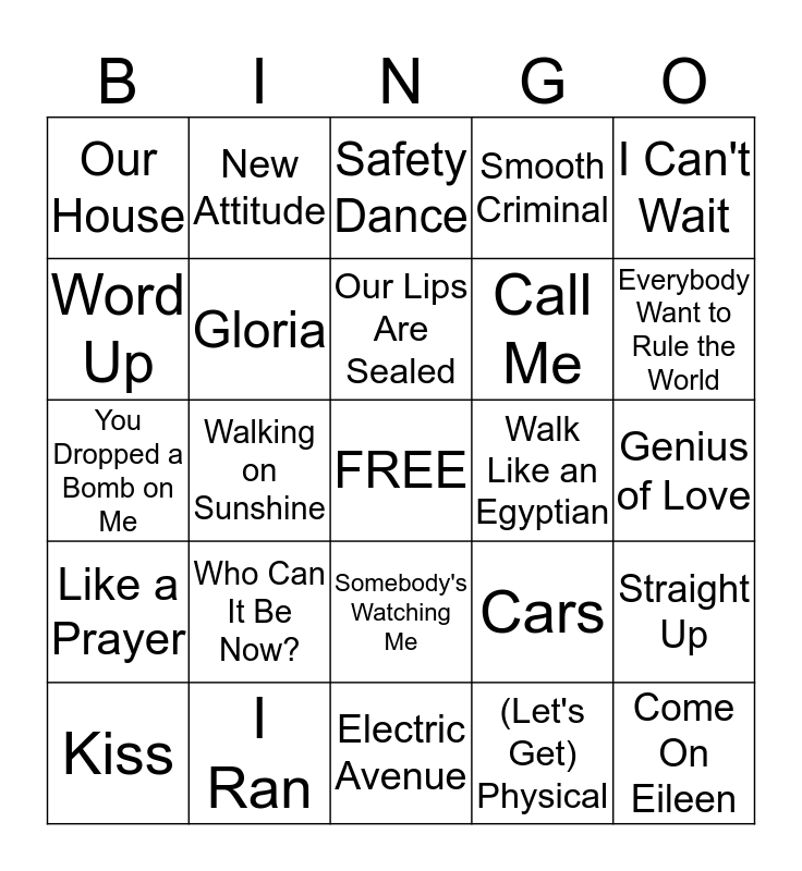 This bingo card has a free space and 24 words: Who Can It Be Now?, I Ran, Our Lips Are Sealed, Kiss, I Can't Wait, Our House, Word Up, New Attitude, Walk Like an Egyptian, Somebody's Watching Me, Call Me, You Dropped a Bomb on Me, Cars, Straight Up, Gloria, (Let's Get) Physical, Genius of Love, Safety Dance, Everybody Want to Rule the World, Walking on Sunshine, Come On Eileen, Like a Prayer, Smooth Criminal and Electric Avenue.