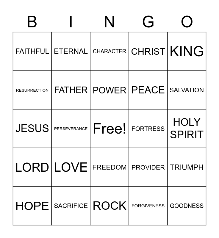 This bingo card has a free space and 29 words: HOPE, GUIDANCE, PERSEVERANCE, SON, FAITHFUL, CHARACTER, FATHER, LOVE, FORTRESS, SACRIFICE, HOLY SPIRIT, GOODNESS, ROCK, FORGIVENESS, SALVATION, LIGHT, FREEDOM, LORD, KING, JESUS, PROVIDER, HEART, PEACE, RESURRECTION, CHRIST, ETERNAL, TRIUMPH, POWER and AUTHORITY.