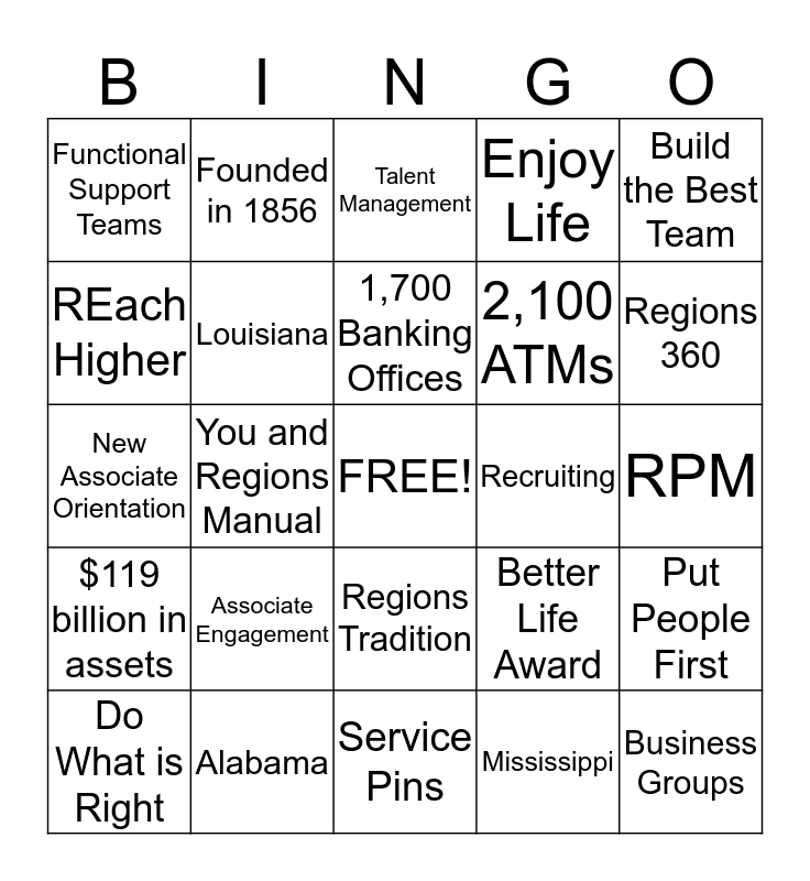 This bingo card has a free space and 58 words: Arkansas, Alabama, Florida, $119 billion in assets, Mississippi, Texas, Louisiana, Georgia, 2,100 ATMs, Reach Higher, Enjoy Life, Focus on Your Customer, Customer-Centric, Dynamic, Geographies, Functional Support Teams, Business Groups, Build the Best Team, Founded in 1856, 1,700 Banking Offices, Recruiting, Talent Management, Do What is Right, Put People First, Gallup, RPM, Lifegreen, life@regions, Regions 360, Shared Value, TeamGreen, Bicycle, Regions Center, Lakeshore, ROC, Riverchase North, Riverchase South, You and Regions Manual, New Associate Orientation, Compliance Training, Associate Engagement, Share the Good, Better Life Award, Evergreen, South Region, Grayson Hall, Regions Field, Regions Tradition, Service Pins, My Workday, Talent Management, Do what is right, Put People First, Build the Best Team, Founded in 1856, Recruiting, REach Higher and Enjoy life.