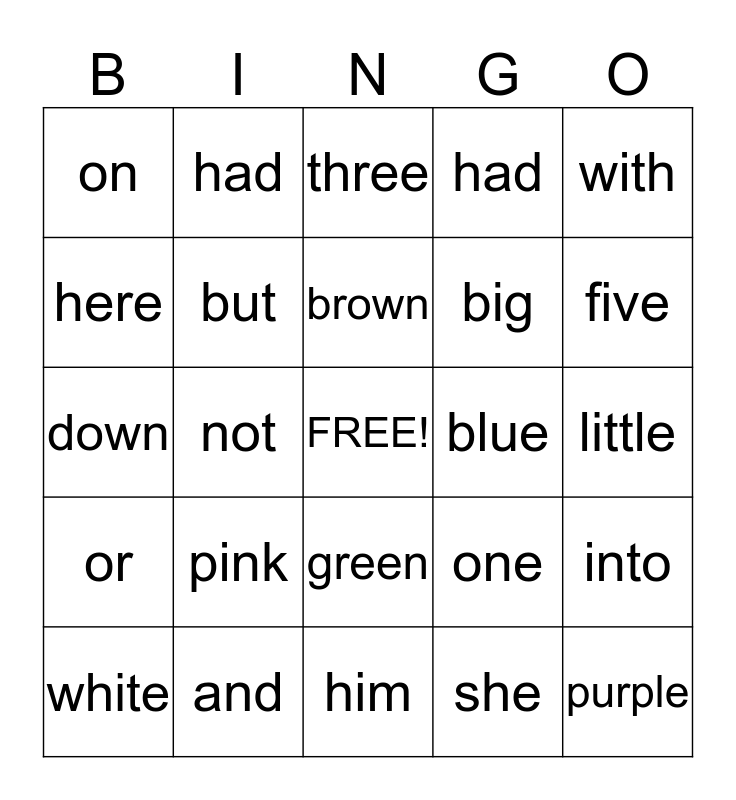 This bingo card has a free space and 24 words: pink, and, brown, white, with, on, here, had, blue, green, big, down, one, into, but, she, little, three, five, not, purple, or, had and him.