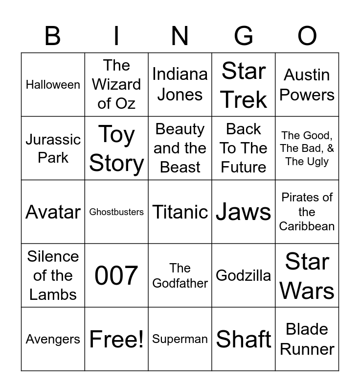 This bingo card has 30 words: Free!, Forrest Gump, Ghostbusters, E.T., Halloween, Indiana Jones, Toy Story, The Godfather, Jaws, Superman, Pirates of the Caribbean, Titanic, Shaft, Blade Runner, The Good, The Bad, & The Ugly, 2001: A Space Odyssey, Godzilla, Silence of the Lambs, 007, Austin Powers, Avatar, Psycho, The Wizard of Oz, Back To The Future, Jurassic Park, Star Trek, Star Wars, Avengers, Beauty and the Beast and Batman.