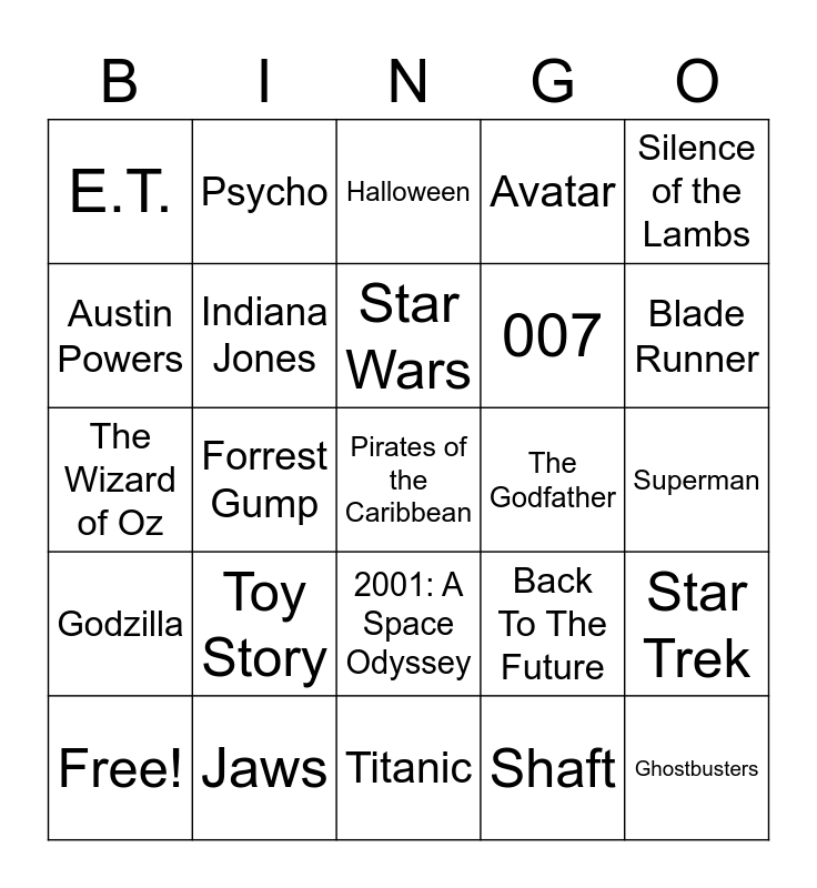 This bingo card has 29 words: Free!, Rocky, Forrest Gump, Ghostbusters, E.T., Halloween, Indiana Jones, Toy Story, The Godfather, Jaws, Superman, Pirates of the Caribbean, Titanic, Shaft, Blade Runner, The Good, The Bad, & The Ugly, 2001: A Space Odyssey, Godzilla, Silence of the Lambs, The Wizard of Oz, Back To The Future, Jurassic Park, 007, Austin Powers, Avatar, Psycho, Star Trek, Star Wars and Avengers.