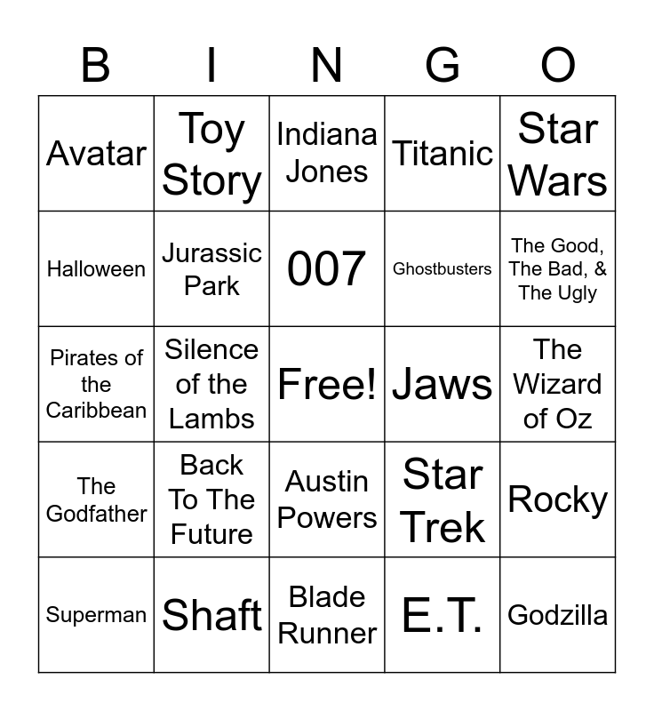 This bingo card has a free space and 28 words: Rocky, Forrest Gump, Ghostbusters, E.T., Halloween, Indiana Jones, Toy Story, The Godfather, Jaws, Superman, Pirates of the Caribbean, Titanic, Shaft, Blade Runner, The Good, The Bad, & The Ugly, 2001: A Space Odyssey, Back To The Future, Jurassic Park, 007, Austin Powers, Avatar, Psycho, Godzilla, Silence of the Lambs, The Wizard of Oz, Star Trek, Star Wars and Avengers.