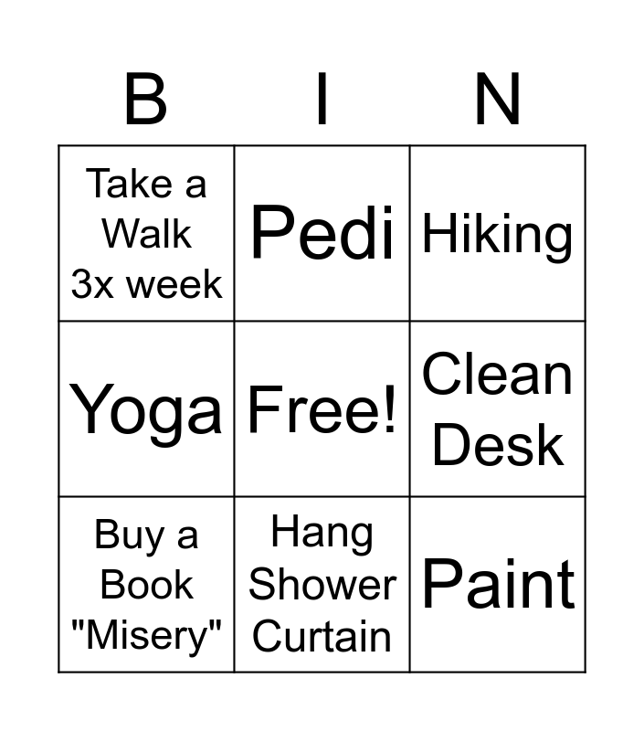 This bingo card has a free space and 8 words: Clean Desk, Hiking, Pedi, Buy a Book "Misery", Take a Walk 3x week, Paint, Yoga and Hang Shower Curtain.