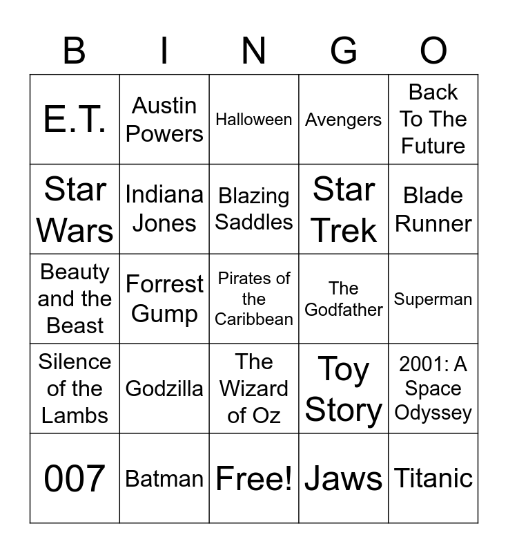 This bingo card has 31 words: Free!, Rocky, Forrest Gump, Ghostbusters, E.T., Halloween, Indiana Jones, Toy Story, The Godfather, Jaws, Superman, Pirates of the Caribbean, Titanic, Shaft, Blade Runner, The Good, The Bad, & The Ugly, 2001: A Space Odyssey, Godzilla, Silence of the Lambs, The Wizard of Oz, Back To The Future, Jurassic Park, 007, Austin Powers, Star Trek, Star Wars, Avengers, Beauty and the Beast, Batman, Blazing Saddles and Edward Scissorhands.