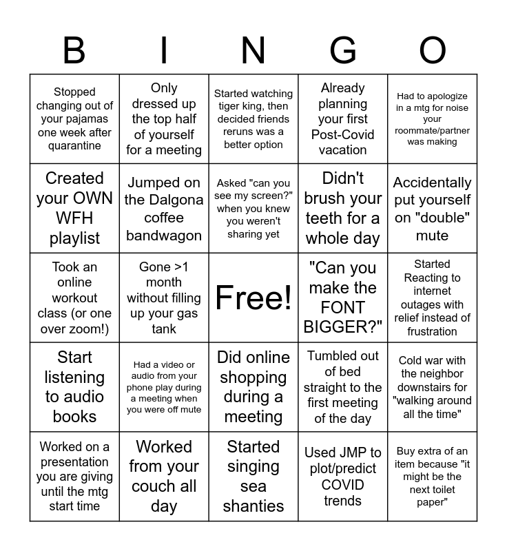 This bingo card has a free space and 24 words: Had a video or audio from your phone play during a meeting when you were off mute, Worked from your couch all day, Asked "can you see my screen?" when you knew you weren't sharing yet, Worked on a presentation you are giving until the mtg start time, Had to apologize in a mtg for noise your roommate/partner was making, Stopped changing out of your pajamas one week after quarantine, Created your OWN WFH playlist, Only dressed up the top half of yourself for a meeting, "Can you make the FONT BIGGER?", Did online shopping during a meeting, Didn't brush your teeth for a whole day, Took an online workout class (or one over zoom!), Tumbled out of bed straight to the first meeting of the day, Cold war with the neighbor downstairs for "walking around all the time", Jumped on the Dalgona coffee bandwagon, Used JMP to plot/predict COVID trends, Started Reacting to internet outages with relief instead of frustration, Started watching tiger king, then decided friends reruns was a better option, Accidentally put yourself on "double" mute, Gone >1 month without filling up your gas tank, Buy extra of an item because "it might be the next toilet paper", Start listening to audio books, Already planning your first Post-Covid vacation and Started singing sea shanties.