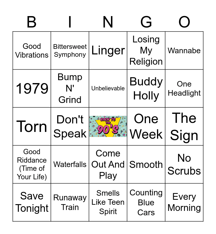 This bingo card has a free space and 50 words: Livin' la Vida Loca, Every Morning, All That She Wants, Smells Like Teen Spirit, Waterfalls, Loser, Bittersweet Symphony, You Oughta Know, 1979, Pony, Bump N' Grind, Losing My Religion, No Scrubs, Smooth, No Rain, Lump, Unbelievable, One Week, Boombastic, Wannabe, Don't Speak, Counting Blue Cars, Good Vibrations, Buddy Holly, C'mon 'N Ride It (The Train), Black or White, One Headlight, A Kiss From a Rose, Linger, Come Out And Play, Crash Into Me, U Can't Touch This, Under the Bridge, MMMBop, Runaway Train, What's Up?, ...Baby One More Time, All Star, Truly Madly Deeply, The Sign, Breakfast At Tiffany's, Closing Time, Two Princes, Iris, Save Tonight, Torn, Friday I'm In Love, Barbie Girl, Good Riddance (Time of Your Life) and Tubthumping.