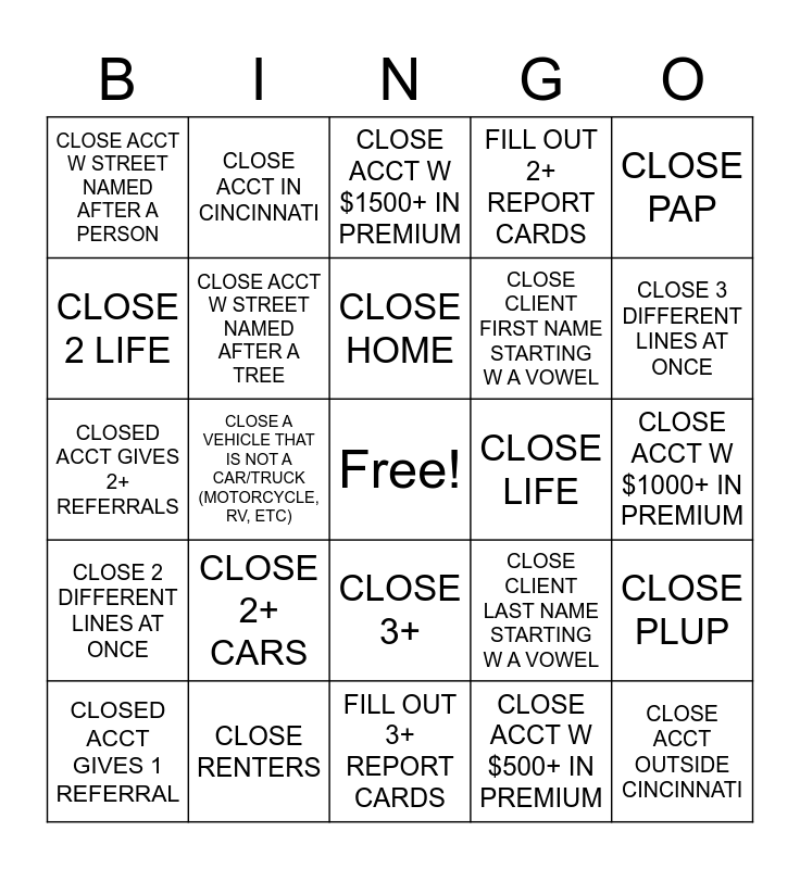 This bingo card has a free space and 24 words: CLOSE 2+ CARS, CLOSE RENTERS, CLOSE HOME, CLOSED ACCT GIVES 1 REFERRAL, CLOSE PAP, CLOSE ACCT W STREET NAMED AFTER A PERSON, CLOSE 2 LIFE, CLOSE ACCT IN CINCINNATI, CLOSE LIFE, CLOSE 3+, CLOSE CLIENT FIRST NAME STARTING W A VOWEL, CLOSED ACCT GIVES 2+ REFERRALS, CLOSE CLIENT LAST NAME STARTING W A VOWEL, CLOSE PLUP, CLOSE ACCT W STREET NAMED AFTER A TREE, CLOSE ACCT W $500+ IN PREMIUM, CLOSE ACCT W $1000+ IN PREMIUM, CLOSE ACCT W $1500+ IN PREMIUM, CLOSE 3 DIFFERENT LINES AT ONCE, CLOSE A VEHICLE THAT IS NOT A CAR/TRUCK (MOTORCYCLE, RV, ETC), CLOSE ACCT OUTSIDE CINCINNATI, CLOSE 2 DIFFERENT LINES AT ONCE, FILL OUT 2+ REPORT CARDS and FILL OUT 3+ REPORT CARDS.