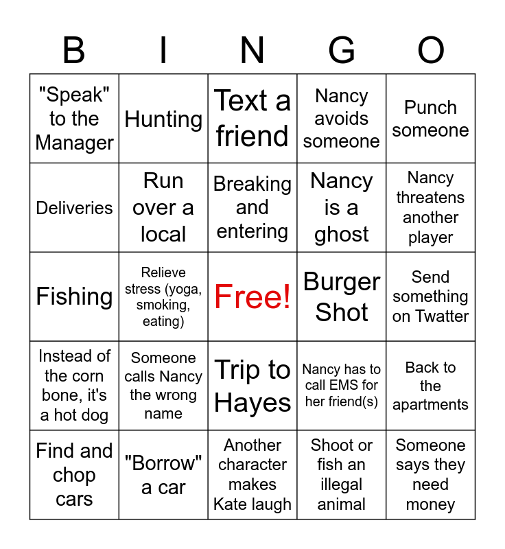 This bingo card has a free space and 24 words: Someone calls Nancy the wrong name, "Borrow" a car, Breaking and entering, Find and chop cars, Punch someone, "Speak" to the Manager, Deliveries, Hunting, Burger Shot, Trip to Hayes, Nancy is a ghost, Fishing, Nancy has to call EMS for her friend(s), Back to the apartments, Run over a local, Shoot or fish an illegal animal, Send something on Twatter, Text a friend, Nancy threatens another player, Relieve stress (yoga, smoking, eating), Someone says they need money, Instead of the corn bone, it's a hot dog, Nancy avoids someone and Another character makes Kate laugh.