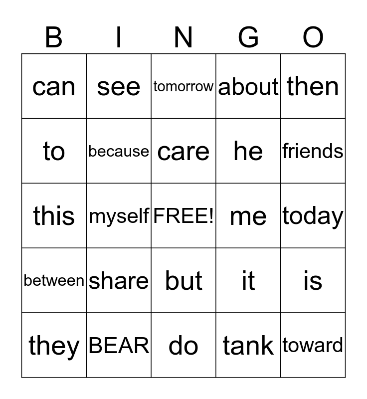 This bingo card has a free space and 24 words: share, BEAR, care, they, then, can, to, see, me, but, he, this, it, is, because, tank, today, tomorrow, friends, myself, toward, between, about and do.