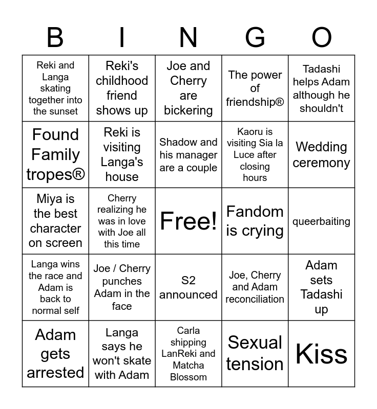 This bingo card has a free space and 24 words: Joe / Cherry punches Adam in the face, Langa says he won't skate with Adam, Shadow and his manager are a couple, Adam gets arrested, Tadashi helps Adam although he shouldn't, Reki and Langa skating together into the sunset, Found Family tropes®, Reki's childhood friend shows up, Fandom is crying, S2 announced, Kaoru is visiting Sia la Luce after closing hours, Miya is the best character on screen, Joe, Cherry and Adam reconciliation, Adam sets Tadashi up, Reki is visiting Langa's house, Sexual tension, queerbaiting, Joe and Cherry are bickering, Wedding ceremony, Cherry realizing he was in love with Joe all this time, Kiss, Langa wins the race and Adam is back to normal self, The power of friendship® and Carla shipping LanReki and Matcha Blossom.