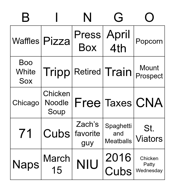 This bingo card has a free space and 24 words: Cubs, March 15, Retired, Naps, Popcorn, Waffles, Boo White Sox, Pizza, Taxes, Zach’s favorite guy, Train, Chicago, Spaghetti and Meatballs, St. Viators, Tripp, 2016 Cubs, CNA, Press Box, Mount Prospect, Chicken Noodle Soup, Chicken Patty Wednesday, 71, April 4th and NIU.