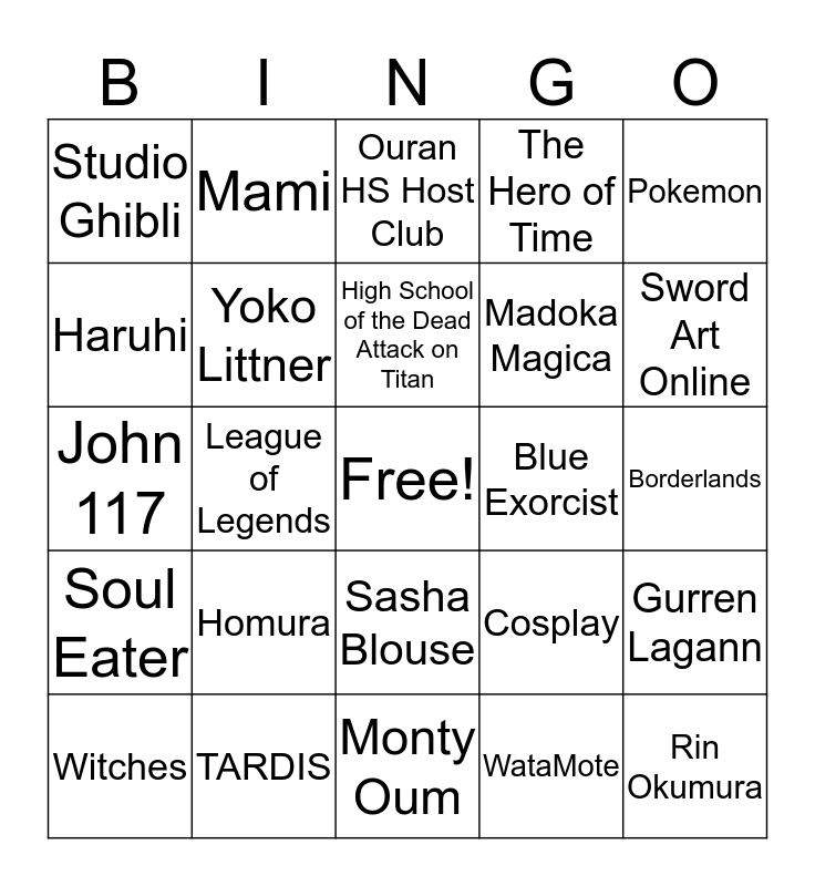 This bingo card has a free space and 28 words: Gurren Lagann, Naruto, Madoka Magica, WataMote, Haruhi, Ouran HS Host Club, Mami, Soul Eater, Blue Exorcist, Witches, John 117, The Hero of Time, TARDIS, Monty Oum, Sword Art Online, Yui, Homura, Yoko Littner, High School of the Dead Attack on Titan, Sasha Blouse, Studio Ghibli, Angel Beats!, Rin Okumura, League of Legends, Borderlands, Cosplay, Pokemon and Xerneas.