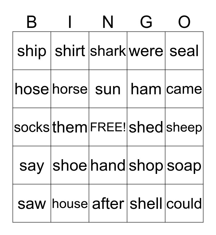 This bingo card has a free space and 24 words: shoe, house, sun, saw, seal, ship, hose, shirt, shed, hand, ham, socks, shop, soap, horse, shell, sheep, shark, came, them, could, say, were and after.