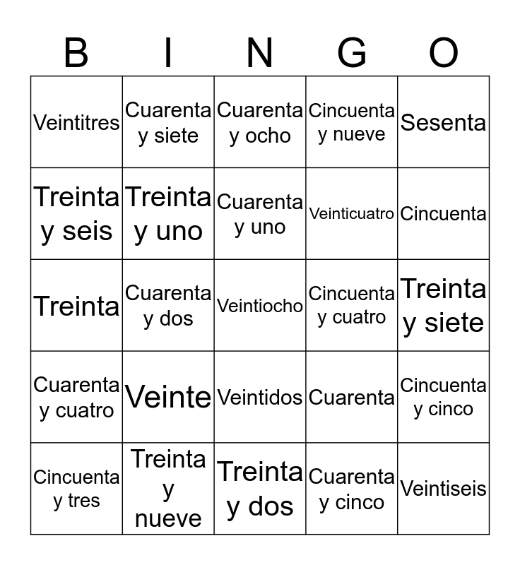 This bingo card has 25 words: Veinte, Treinta y dos, Cuarenta y uno, Cincuenta y tres, Sesenta, Veintitres, Treinta y seis, Cuarenta y siete, Cincuenta y cuatro, Veintidos, Veinticuatro, Treinta, Cuarenta, Cincuenta y cinco, Treinta y uno, Veintiseis, Treinta y siete, Cuarenta y ocho, Cincuenta, Cuarenta y dos, Veintiocho, Treinta y nueve, Cuarenta y cuatro, Cincuenta y nueve and Cuarenta y cinco.