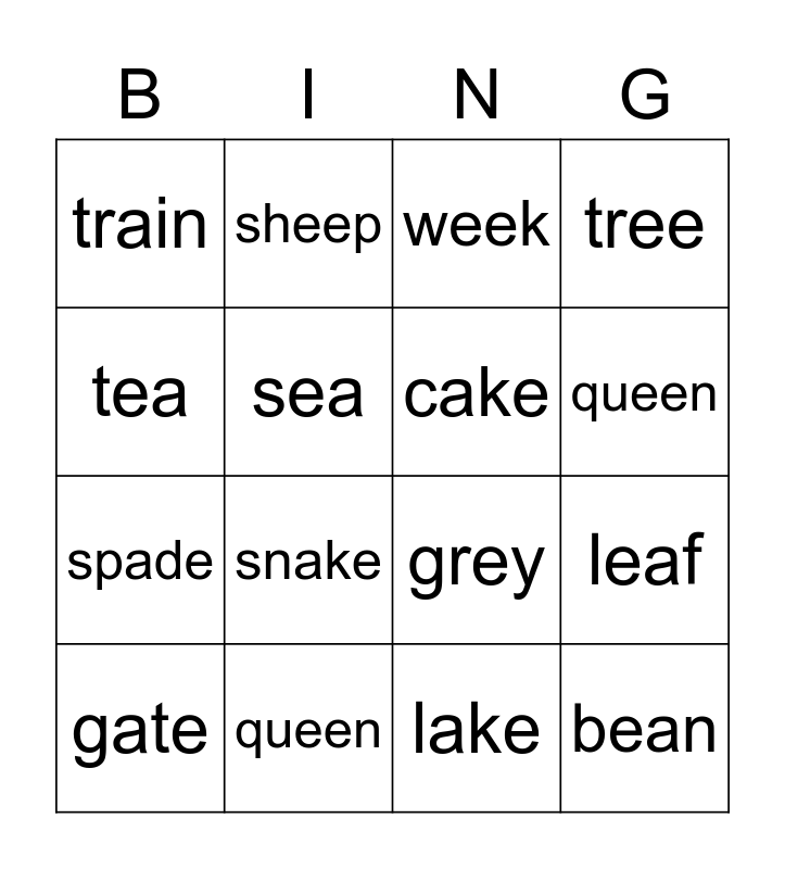 This bingo card has 18 words: snake, bean, week, train, grey, tree, gate, sheep, queen, spade, lake, tea, leaf, sea, cake, rain, queen and green.