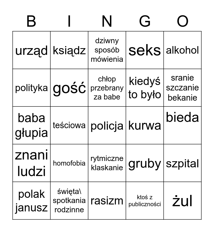This bingo card has 25 words: homofobia, rasizm, chłop przebrany za babe, polak janusz, alkohol, urząd, polityka, ksiądz, kurwa, rytmiczne klaskanie, kiedyś to było, baba głupia, gruby, szpital, gość, żul, bieda, dziwny sposób mówienia, sranie szczanie bekanie, teściowa, policja, święta\ spotkania rodzinne, znani ludzi, seks and ktoś z publiczności.