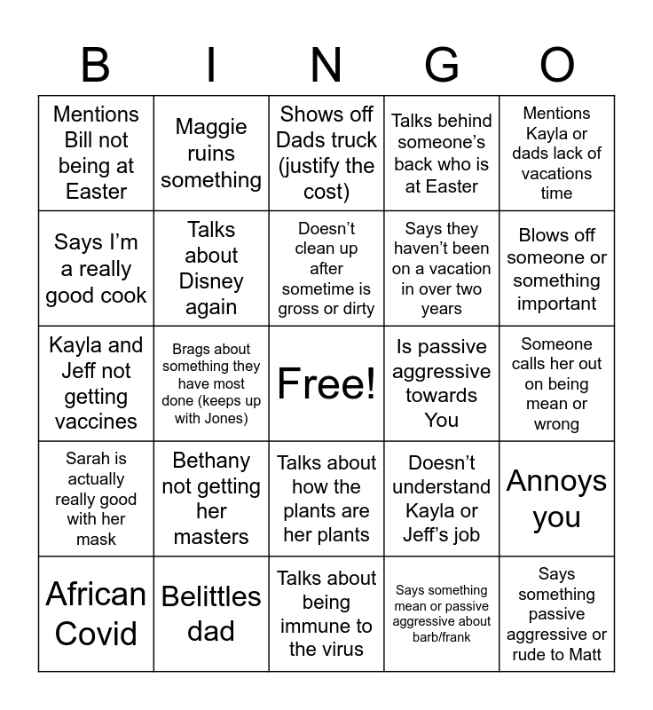 This bingo card has a free space and 24 words: Bethany not getting her masters, Belittles dad, Doesn’t clean up after sometime is gross or dirty, African Covid, Mentions Kayla or dads lack of vacations time, Mentions Bill not being at Easter, Says I’m a really good cook, Maggie ruins something, Is passive aggressive towards You, Talks about how the plants are her plants, Says they haven’t been on a vacation in over two years, Kayla and Jeff not getting vaccines, Doesn’t understand Kayla or Jeff’s job, Annoys you, Talks about Disney again, Says something mean or passive aggressive about barb/frank, Someone calls her out on being mean or wrong, Shows off Dads truck (justify the cost), Blows off someone or something important, Brags about something they have most done (keeps up with Jones), Says something passive aggressive or rude to Matt, Sarah is actually really good with her mask, Talks behind someone’s back who is at Easter and Talks about being immune to the virus.