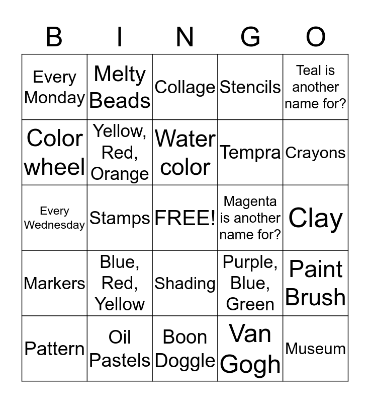 This bingo card has a free space and 24 words: Blue, Red, Yellow, Oil Pastels, Water color, Pattern, Teal is another name for?, Every Monday, Color wheel, Melty Beads, Magenta is another name for?, Shading, Tempra, Every Wednesday, Purple, Blue, Green, Paint Brush, Yellow, Red, Orange, Van Gogh, Clay, Collage, Crayons, Stamps, Museum, Markers, Stencils and Boon Doggle.