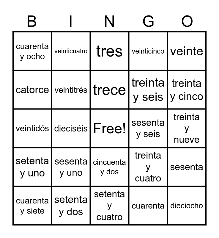 This bingo card has a free space and 75 words: uno, dos, tres, cuatro, cinco, seis, siete, ocho, nueve, diez, once, doce, trece, catorce, quince, dieciséis, diecisiete, dieciocho, diecinueve, veinte, veintiuno, veintidós, veintitrés, veinticuatro, veinticinco, veintiséis, veintisiete, veintiocho, veintinueve, treinta, treinta y uno, treinta y dos, treinta y tres, treinta y cuatro, treinta y cinco, treinta y seis, treinta y siete, treinta y ocho, treinta y nueve, cuarenta, cuarenta y uno, cuarenta y dos, cuarenta y tres, cuarenta y cuatro, cuarenta y cinco, curenta y seis, cuarenta y siete, cuarenta y ocho, cuarenta y nueve, cincuenta, cincuenta y uno, cincuenta y dos, cincuenta y tre, cincuenta y cuatro, cincuenta y cinco, cincuenta y seis, cincuenta y siete, cincuenta y ocho, cincuenta y nueve, sesenta, sesenta y uno, sesenta y dos, sesenta y tres, sesenta y cuatro, sesenta y cinco, sesenta y seis, sesenta y siete, sesenta y ocho, sesenta y nueve, sesenta, setenta y uno, setenta y dos, setenta y tres, setenta y cuatro and setenta y cinco.