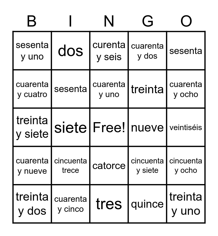 This bingo card has a free space and 72 words: uno, dos, tres, cuatro, cinco, seis, siete, ocho, nueve, diez, once, doce cuarenta, cuarenta y uno, cuarenta y dos, cuarenta y tres, cuarenta y cuatro, cuarenta y cinco, curenta y seis, cuarenta y siete, cuarenta y ocho, cuarenta y nueve, cincuenta trece, catorce, quince, dieciséis, diecisiete, dieciocho, diecinueve, veinte, veintiuno, veintidós, veintitrés, veinticuatro, veinticinco, veintiséis, veintisiete, veintiocho, veintinueve, treinta, treinta y uno, treinta y dos, treinta y tres, treinta y cuatro, treinta y cinco, treinta y seis, treinta y siete, treinta y ocho, treinta y nueve cincuenta y uno, cincuenta y dos, cincuenta y tre, cincuenta y cuatro, cincuenta y cinco, cincuenta y seis, cincuenta y siete, cincuenta y ocho, cincuenta y nueve, sesenta, sesenta y uno, sesenta y dos, sesenta y tres, sesenta y cuatro, sesenta y cinco, sesenta y seis, sesenta y siete, sesenta y ocho, sesenta y nueve, sesenta, setenta y uno, setenta y dos, setenta y tres, setenta y cuatro and setenta y cinco.