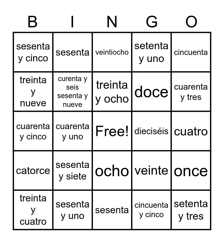This bingo card has a free space and 74 words: veintiséis, veintisiete, veintiocho, veintinueve, treinta, treinta y uno, treinta y dos, treinta y tres, treinta y cuatro, treinta y cinco, treinta y seis, treinta y siete, treinta y ocho, treinta y nueve, cuarenta, cuarenta y uno, cuarenta y dos, cuarenta y tres, cuarenta y cuatro, cuarenta y cinco, curenta y seis sesenta y nueve, sesenta, setenta y uno, setenta y dos, setenta y tres, setenta y cuatro, setenta y cinco, cuarenta y siete, cuarenta y ocho, cuarenta y nueve, cincuenta, cincuenta y uno, cincuenta y dos, cincuenta y tre, cincuenta y cuatro, cincuenta y cinco, cincuenta y seis, cincuenta y siete, cincuenta y ocho, cincuenta y nueve, sesenta, sesenta y uno, sesenta y dos, sesenta y tres, sesenta y cuatro, sesenta y cinco, sesenta y seis, sesenta y siete, sesenta y ocho, uno, dos, tres, cuatro, cinco, seis, siete, ocho, nueve, diez, once, doce, trece, catorce, quince, dieciséis, diecisiete, dieciocho, diecinueve, veinte, veintiuno, veintidós, veintitrés, veinticuatro and veinticinco.