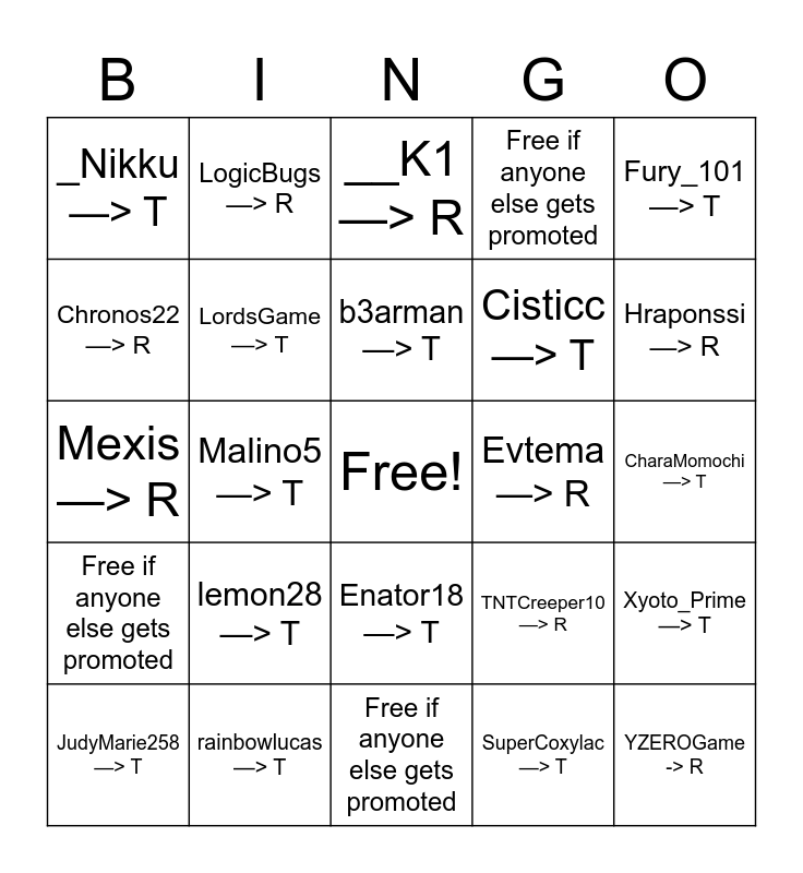 This bingo card has a free space and 24 words: lemon28 —> T, rainbowlucas —> T, b3arman —> T, JudyMarie258 —> T, Fury_101 —> T, _Nikku —> T, Chronos22 —> R, LogicBugs —> R, Evtema —> R, Enator18 —> T, Cisticc —> T, Mexis —> R, TNTCreeper10 —> R, Xyoto_Prime —> T, LordsGame —> T, SuperCoxylac —> T, CharaMomochi —> T, __K1 —> R, Hraponssi —> R, Malino5 —> T, YZEROGame -> R, Free if anyone else gets promoted, Free if anyone else gets promoted and Free if anyone else gets promoted.
