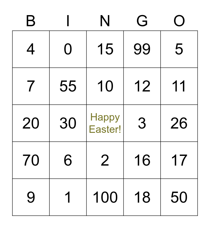 This bingo card has a free space and 24 words: 6, 1, 10, 9, 5, 4, 7, 0, 3, 2, 12, 20, 16, 17, 55, 18, 26, 15, 11, 30, 50, 70, 99 and 100.