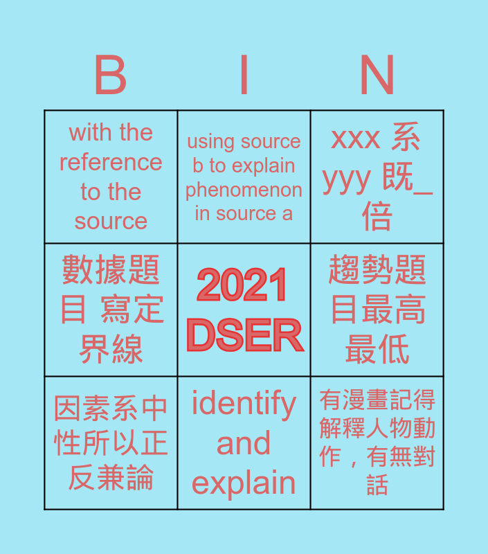 This bingo card has a free space and 8 words: 數據題目 寫定界線, using source b to explain phenomenon in source a, 趨勢題目最高最低, 因素系中性所以正反兼論, xxx 系yyy 既_倍, with the reference to the source, identify and explain and 有漫畫記得解釋人物動作,有無對話.