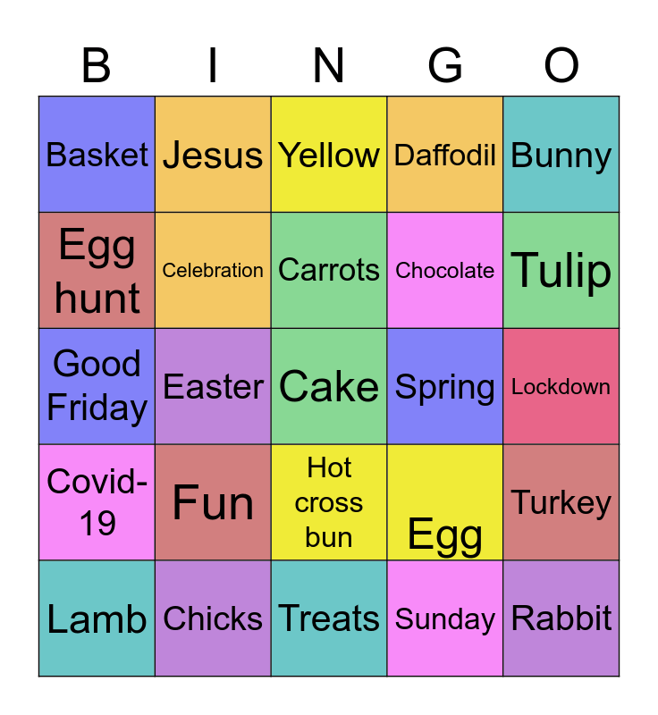 This bingo card has a free space and 26 words: Hot cross bun, Sunday, Carrots, Chicks, Bunny, Basket, Egg hunt, Jesus, Lockdown, Egg, Chocolate, Good Friday, Turkey, Lamb, Easter, Family, Daffodil, Covid-19, Yellow, Rabbit, Tulip, Treats, Spring, Fun, Celebration and Hop.