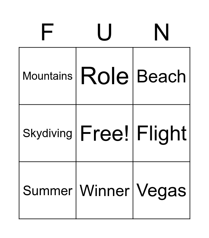 This bingo card has a free space and 17 words: Vacation, Bucket List, Beach, Mountains, Ireland, Skydiving, Family, Summer, Winner, Flight, Plane, Hiking, Vegas, Role, Launch, Region and Fun.