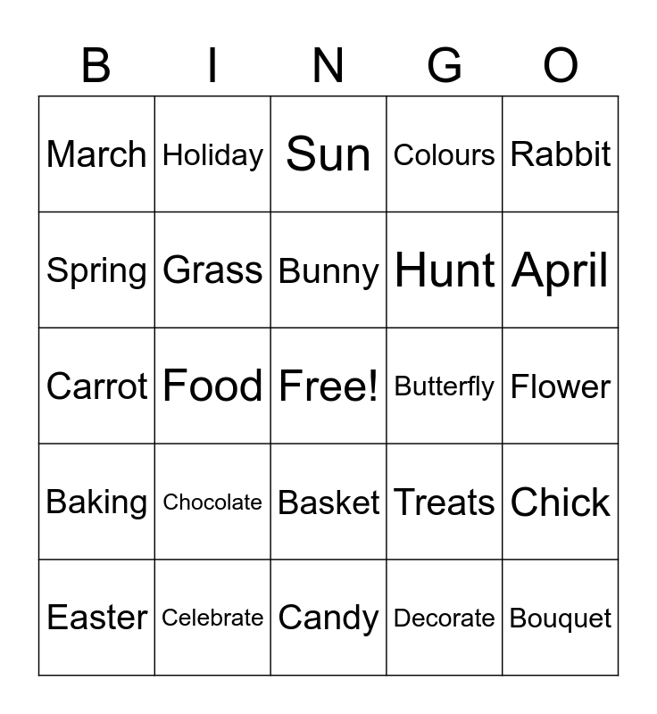 This bingo card has a free space and 25 words: Chocolate, Candy, Bunny, Easter, Rabbit, March, Spring, Holiday, Butterfly, Basket, Hunt, Carrot, Treats, Chick, Grass, Dye, Flower, Sun, April, Food, Bouquet, Celebrate, Baking, Colours and Decorate.