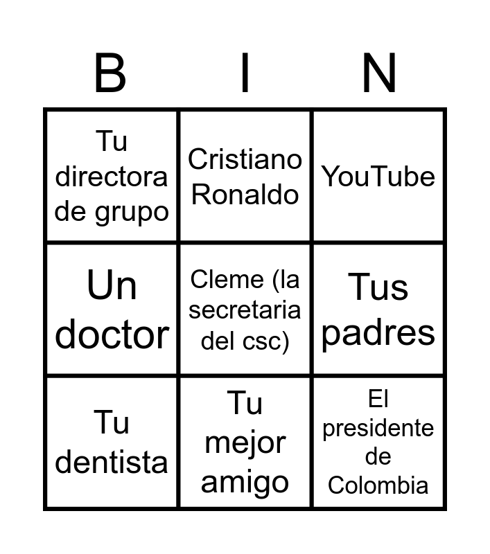 This bingo card has 18 words: Free!, El periódico El Tiempo, YouTube, Tu directora de grupo, La alcaldesa, Un doctor, Un granjero, Cristiano Ronaldo, Tu mejor amigo, El presidente de Colombia, El presidente de estados unidos, Cleme (la secretaria del csc), La sección del clima del noticiero, Tus padres, Tu dentista, Wikipedia, Redes sociales and Un periodista musical.