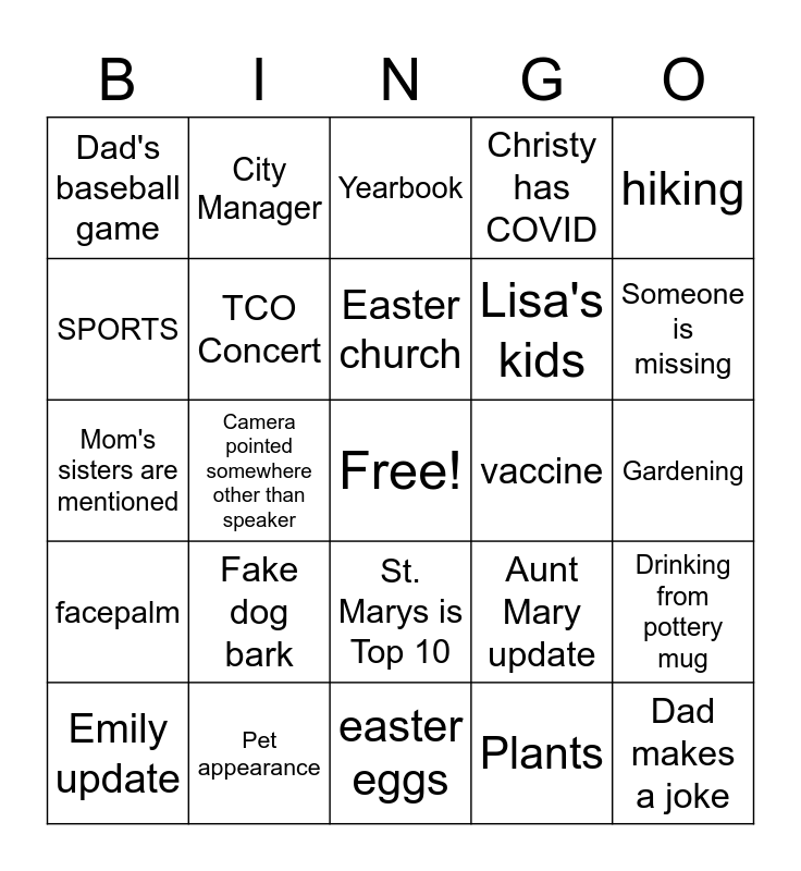 This bingo card has a free space and 24 words: Fake dog bark, Pet appearance, Easter church, Emily update, hiking, Dad's baseball game, SPORTS, City Manager, vaccine, St. Marys is Top 10, Lisa's kids, Mom's sisters are mentioned, Aunt Mary update, Drinking from pottery mug, TCO Concert, Plants, Gardening, Yearbook, Someone is missing, Camera pointed somewhere other than speaker, Dad makes a joke, facepalm, Christy has COVID and easter eggs.