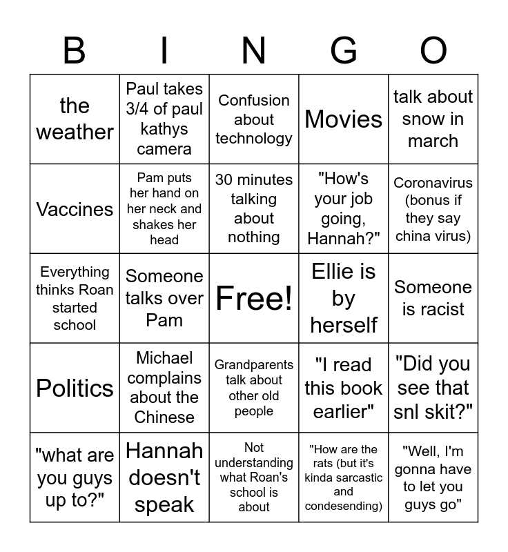 This bingo card has a free space and 24 words: Michael complains about the Chinese, Hannah doesn't speak, 30 minutes talking about nothing, "what are you guys up to?", talk about snow in march, the weather, Vaccines, Paul takes 3/4 of paul kathys camera, Ellie is by herself, Grandparents talk about other old people, "How's your job going, Hannah?", Everything thinks Roan started school, "I read this book earlier", "Did you see that snl skit?", Pam puts her hand on her neck and shakes her head, "How are the rats (but it's kinda sarcastic and condesending), Someone is racist, Confusion about technology, Coronavirus (bonus if they say china virus), Someone talks over Pam, "Well, I'm gonna have to let you guys go", Politics, Movies and Not understanding what Roan's school is about.
