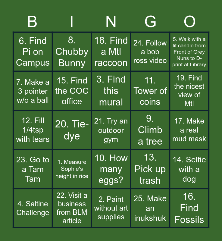 This bingo card has 25 words: 1. Measure Sophie's height in rice, 2. Paint without art supplies, 3. Find this mural, 4. Saltine Challenge, 5. Walk with a lit candle from Front of Grey Nuns to D-print at Library, 6. Find Pi on Campus, 7. Make a 3 pointer w/o a ball, 8. Chubby Bunny, 9. Climb a tree, 10. How many eggs?, 11. Tower of coins, 12. Fill 1/4tsp with tears, 13. Pick up trash, 14. Selfie with a dog, 15. Find the COC office, 16. Find Fossils, 17. Make a real mud mask, 18. Find a Mtl raccoon, 19. Find the nicest view of Mtl, 20. Tie-dye, 21. Try an outdoor gym, 22. Visit a business from BLM article, 23. Go to a Tam Tam, 24. Follow a bob ross video and 25. Make an inukshuk.