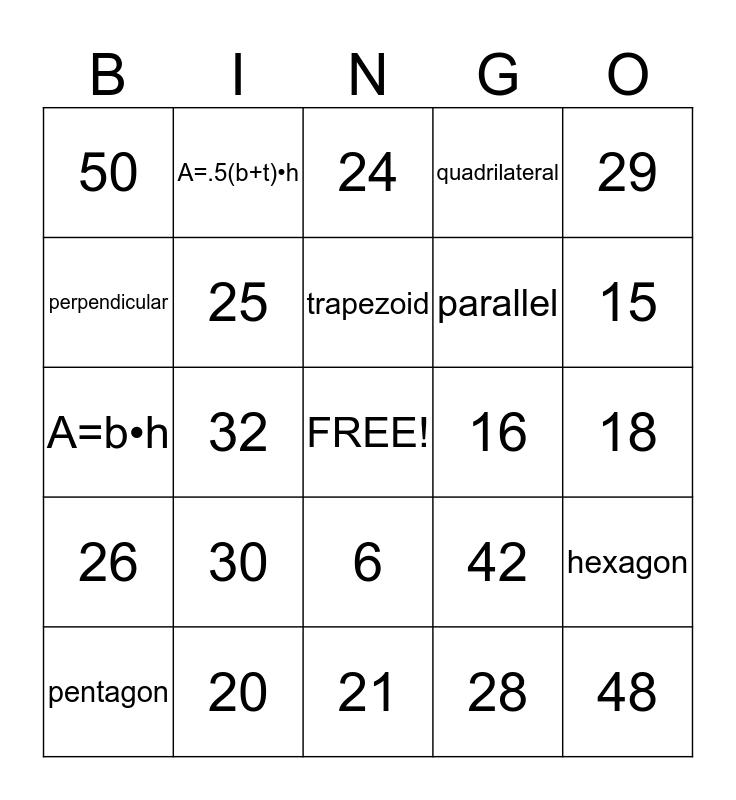 This bingo card has a free space and 30 words: 20, 27, 32, 12, 50, 24, 25, 6, 16, 21, 18, 48, 28, 20, 15, 22, 42, 26, 30, 29, A=b•h, A=.5•b•h, A=.5(b+t)•h, parallel, perpendicular, quadrilateral, hexagon, pentagon, trapezoid and parllelogram.