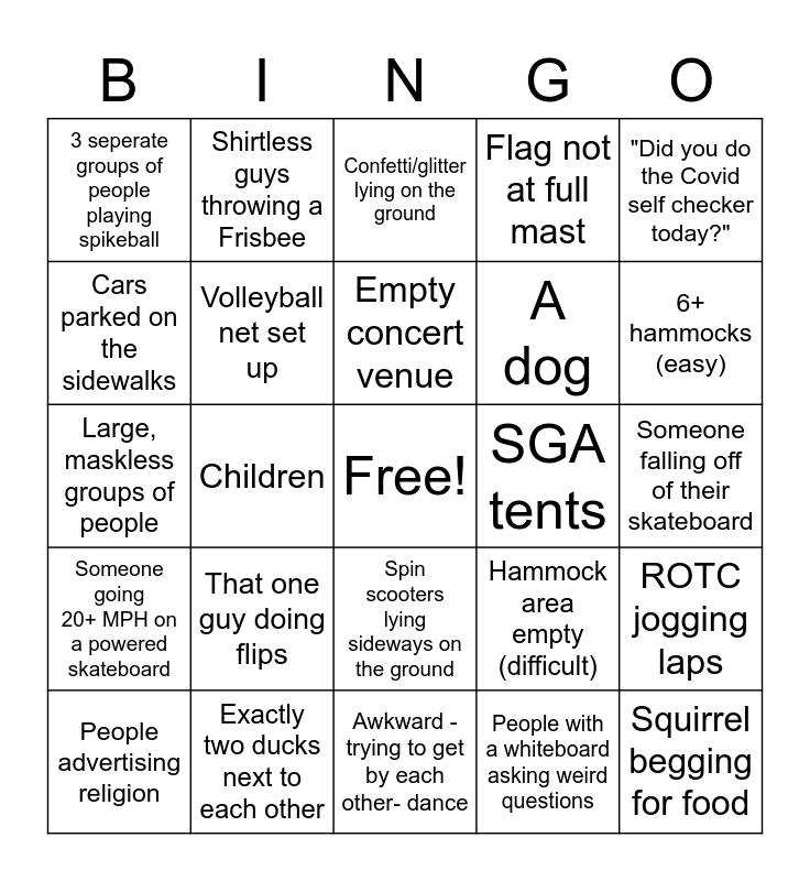 This bingo card has a free space and 24 words: That one guy doing flips, Exactly two ducks next to each other, Empty concert venue, People advertising religion, "Did you do the Covid self checker today?", 3 seperate groups of people playing spikeball, Cars parked on the sidewalks, Shirtless guys throwing a Frisbee, SGA tents, Spin scooters lying sideways on the ground, A dog, Large, maskless groups of people, Hammock area empty (difficult), ROTC jogging laps, Volleyball net set up, People with a whiteboard asking weird questions, Someone falling off of their skateboard, Confetti/glitter lying on the ground, 6+ hammocks (easy), Children, Squirrel begging for food, Someone going 20+ MPH on a powered skateboard, Flag not at full mast and Awkward -trying to get by each other- dance.