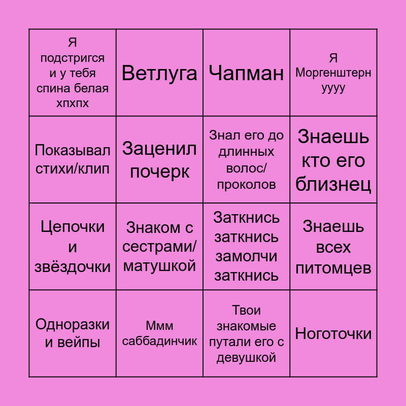 This bingo card has 16 words: Ммм саббадинчик, Знаешь всех питомцев, Чапман, Я подстригся и у тебя спина белая хпхпх, Цепочки и звёздочки, Ветлуга, Заткнись заткнись замолчи заткнись, Твои знакомые путали его с девушкой, Показывал стихи/клип, Заценил почерк, Одноразки и вейпы, Я Моргенштерн уууу, Знаком с сестрами/матушкой, Знаешь кто его близнец, Знал его до длинных волос/проколов and Ноготочки.